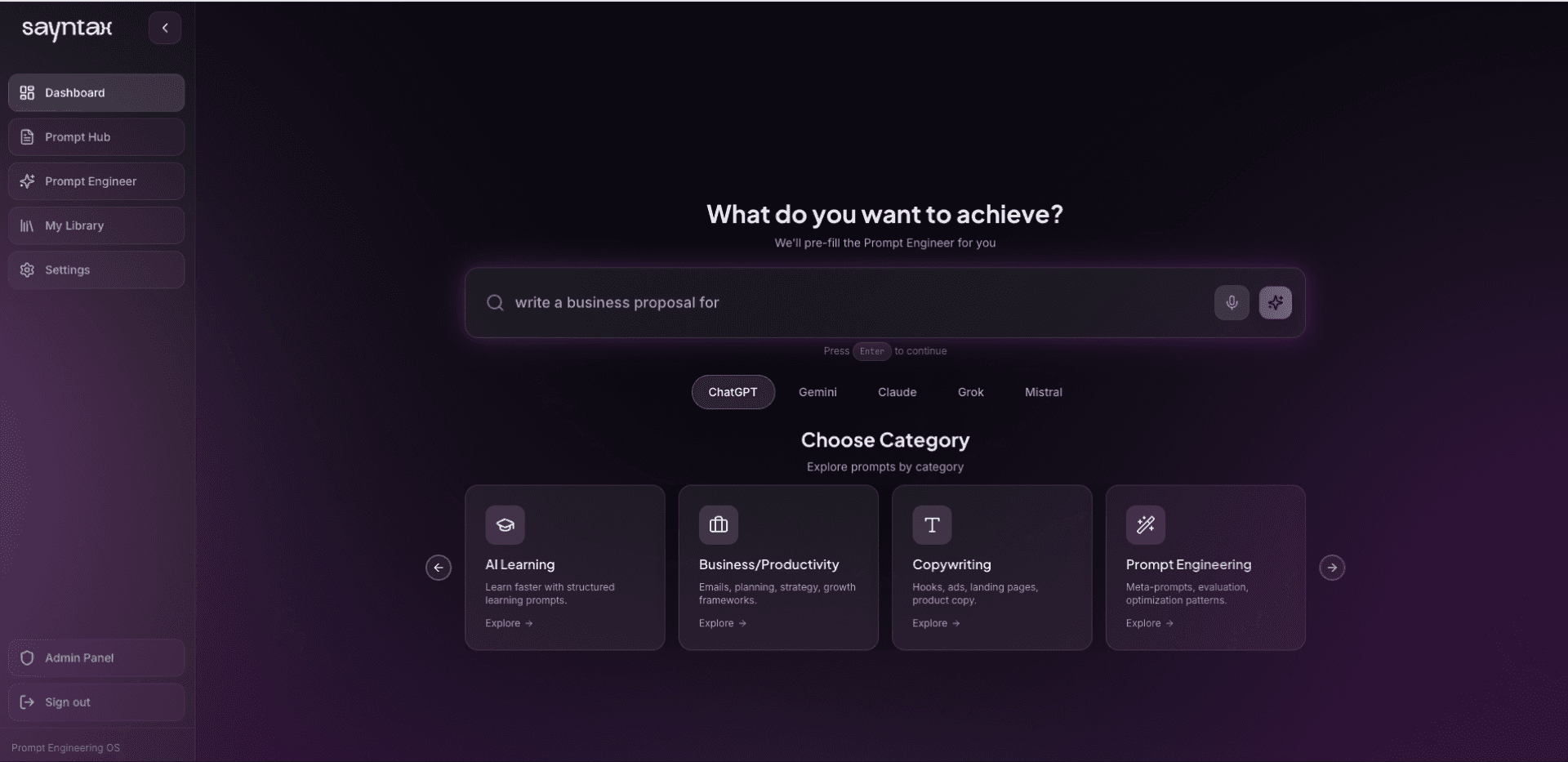 Sayntax is your command center for prompt engineering — built for clarity, control, and creative flow. Master the way you speak to AI.